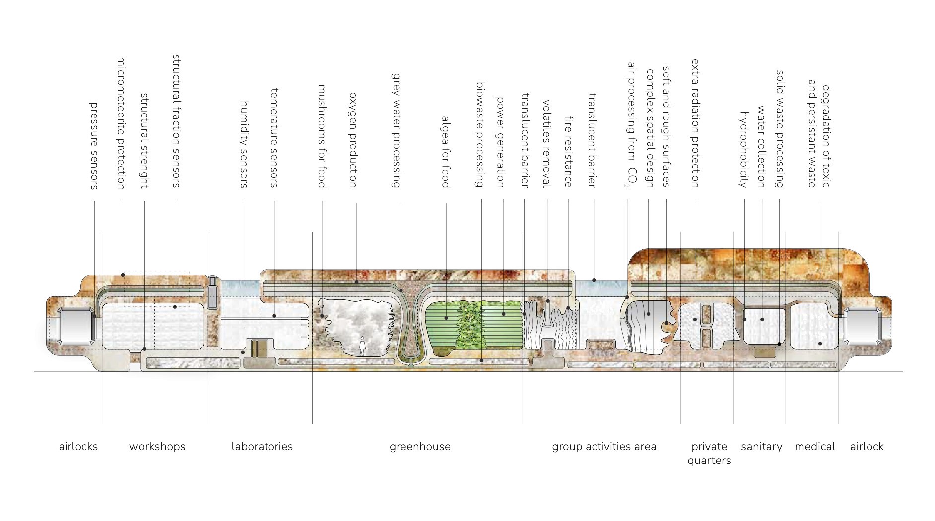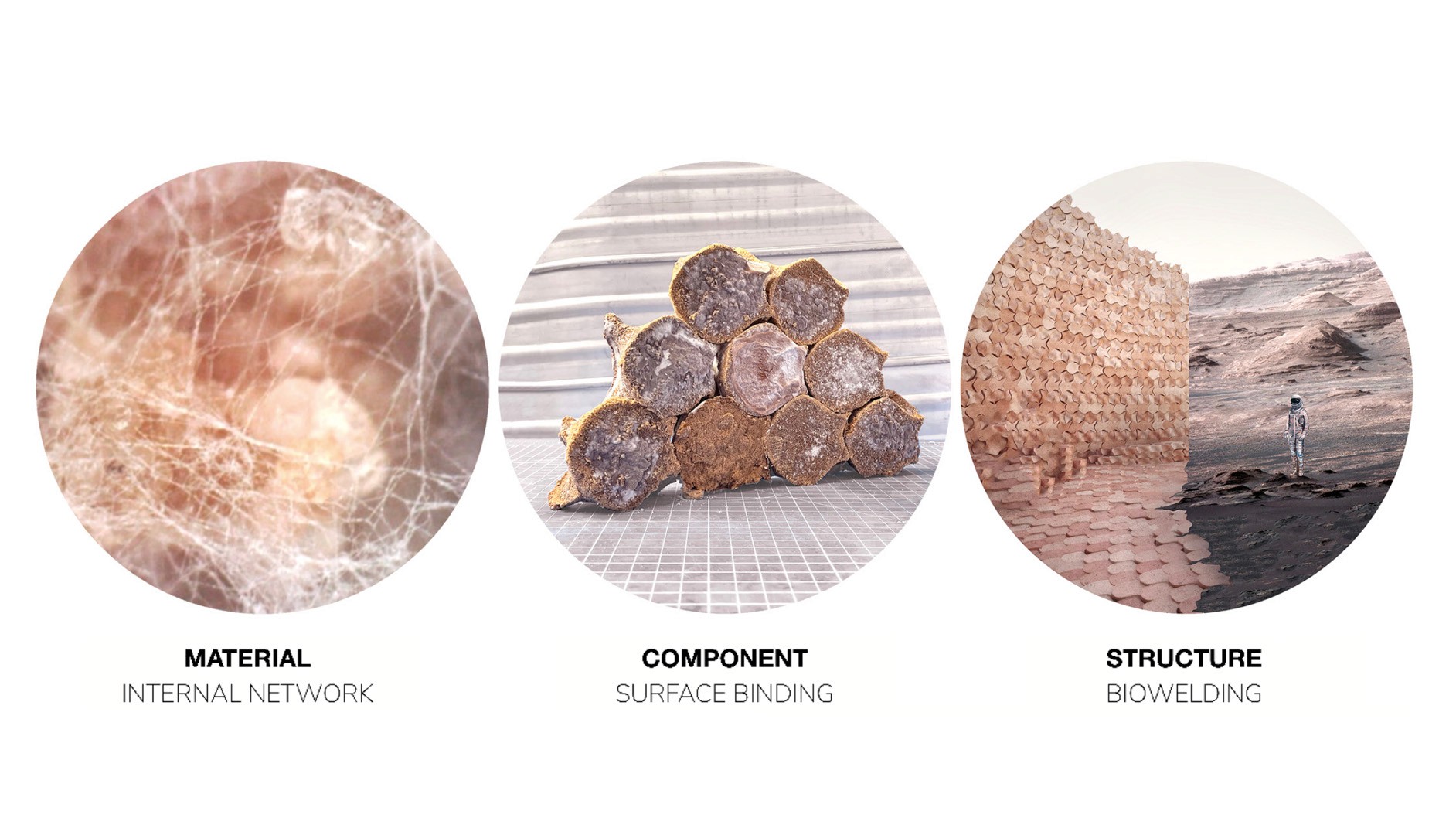 The doctoral research investigates bio-fabrication strategies for Martian habitats using mycelium-based composites grown in situ. Addressing the constraints of transporting materials from Earth, the project proposes a system combining Martian regolith with low-biomass mycelium and leveraging both biological and architectural self-assembly. Mycelium acts as a binding agent while jamming-based aggregation enables structural formation in reduced gravity. Developed in collaboration with NASA’s Myco-Architecture Off-Planet project, the research advances a system-based methodology for living materials in space architecture, demonstrating how adaptive, self-growing structures could support resilient extraterrestrial habitats.