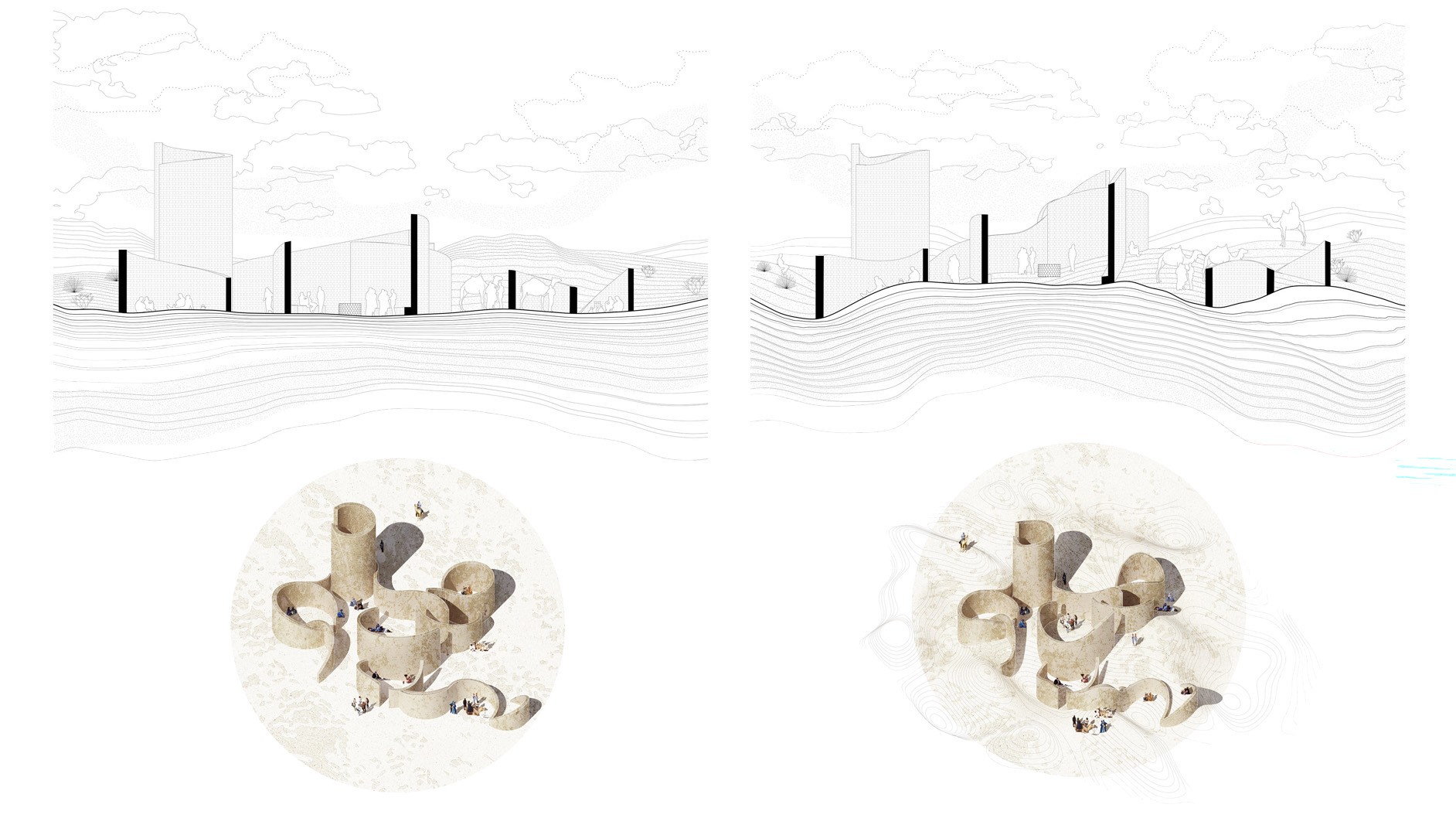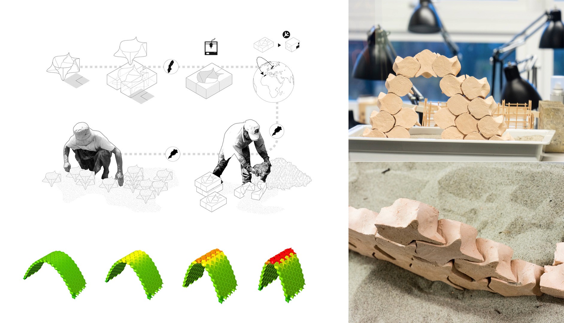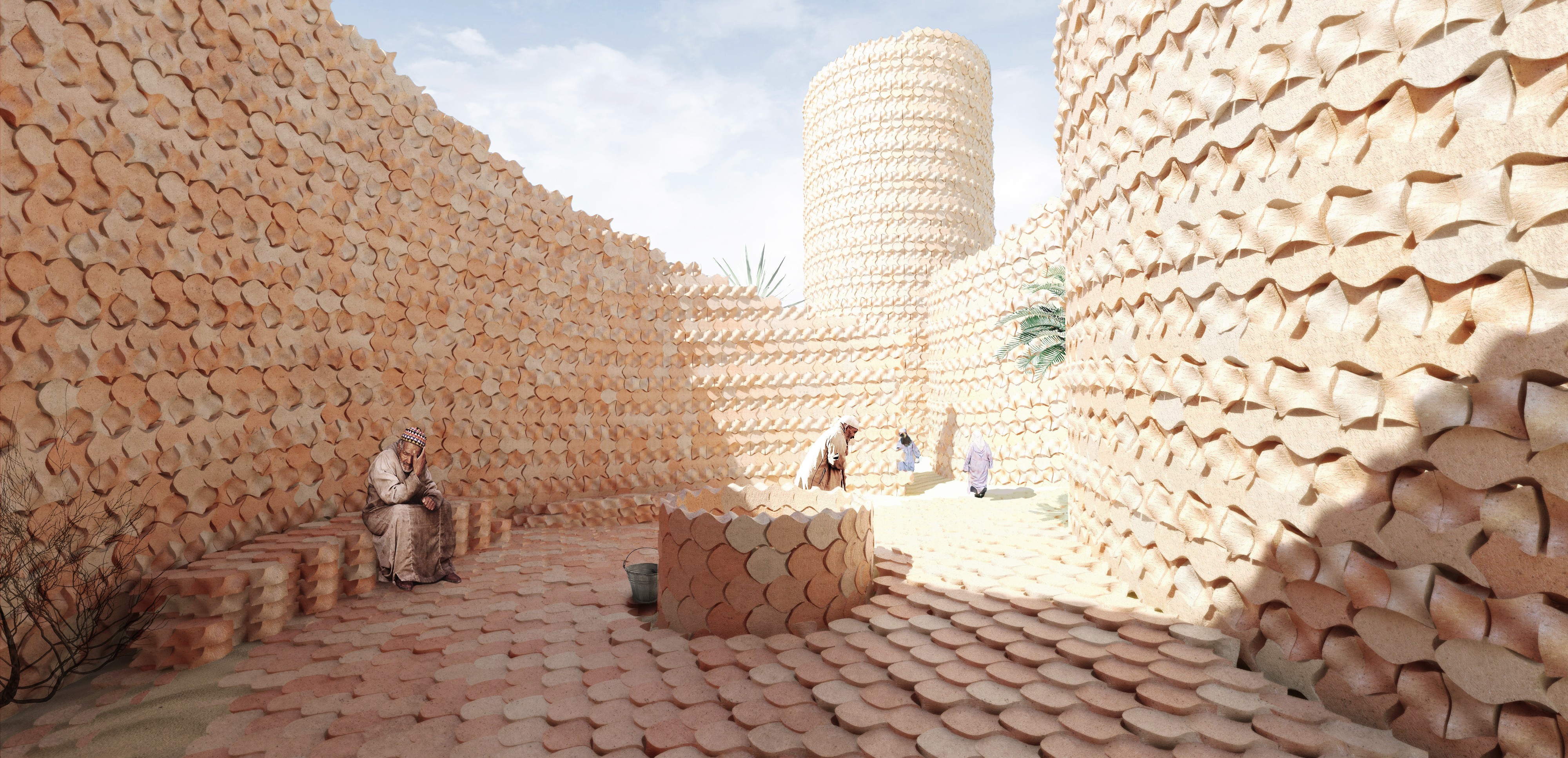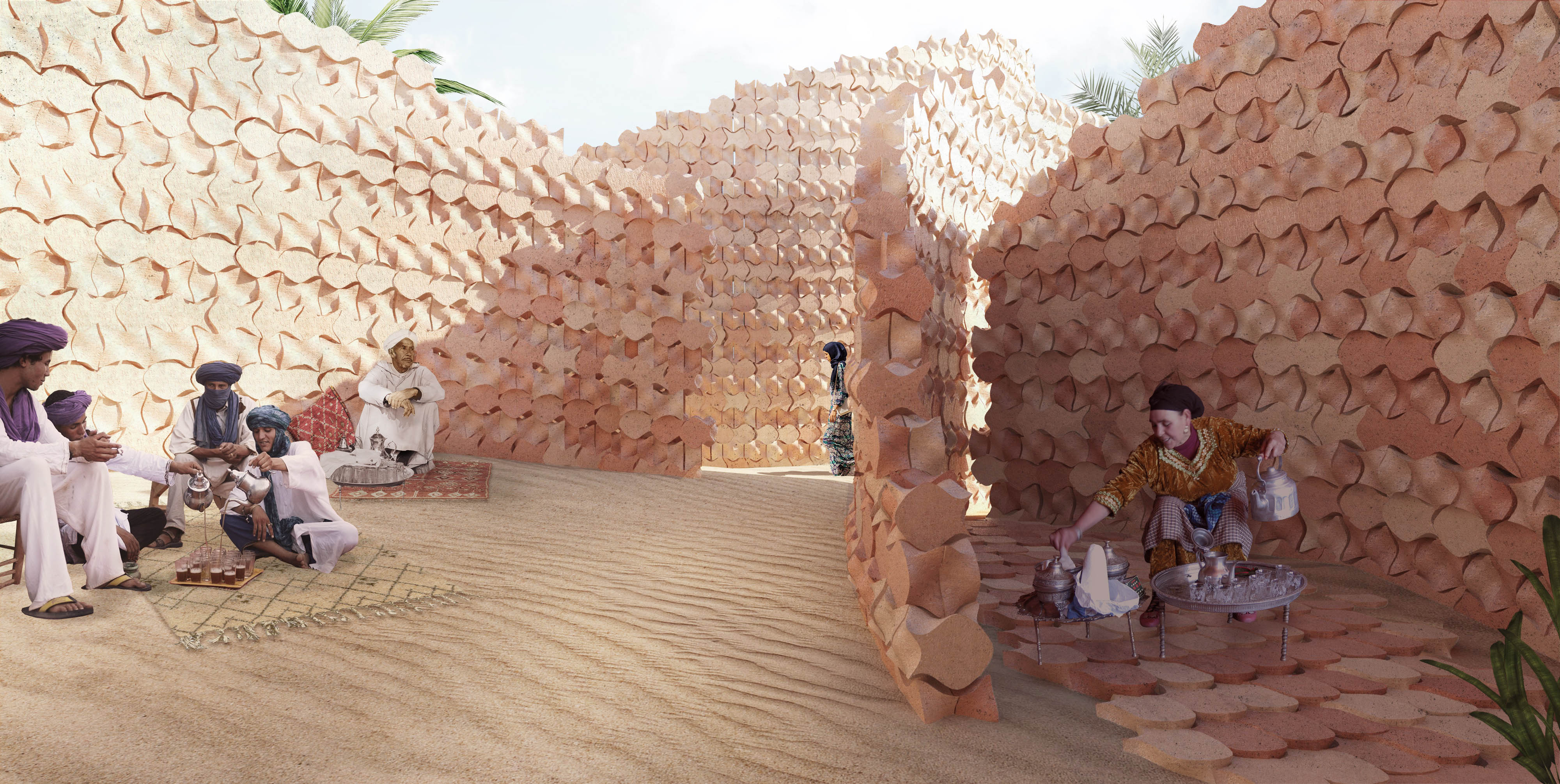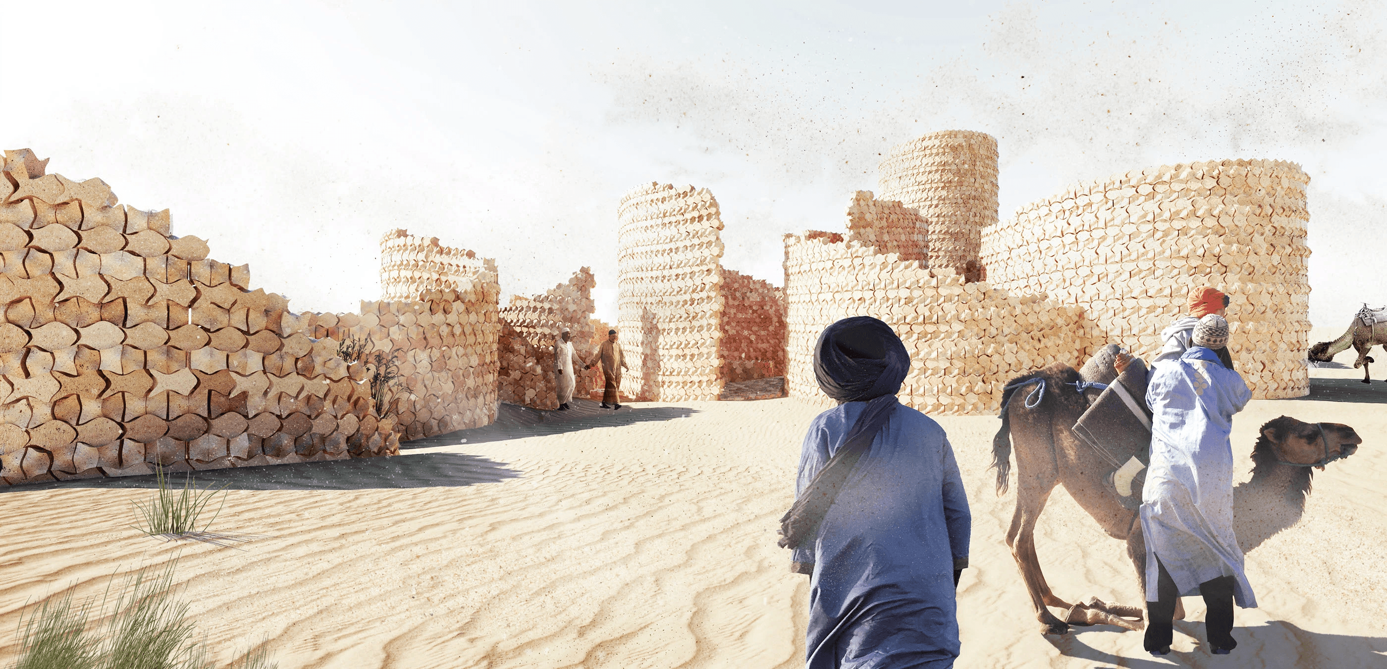 Eternal Oasis is a permanent cultural hub in the Moroccan Sahara celebrating nomadic traditions. Designed to “float” on shifting dunes, the structure uses topological interlocking clay blocks that adapt to sand movement without rigid foundations. Extensive prototyping and sandbox testing informed the final intersecting circular wall system with parabolic profiles for structural balance. Local, low-tech brick production is imperative for the project. Due to the complex geometry, the form is 3D-printed in Sweden and then shipped to Morocco, where it is easily filled with clay by local manufacturers. The project creates a series of atmospheric spaces for trade, storytelling, and gathering—an architectural beacon embedded within the desert landscape.