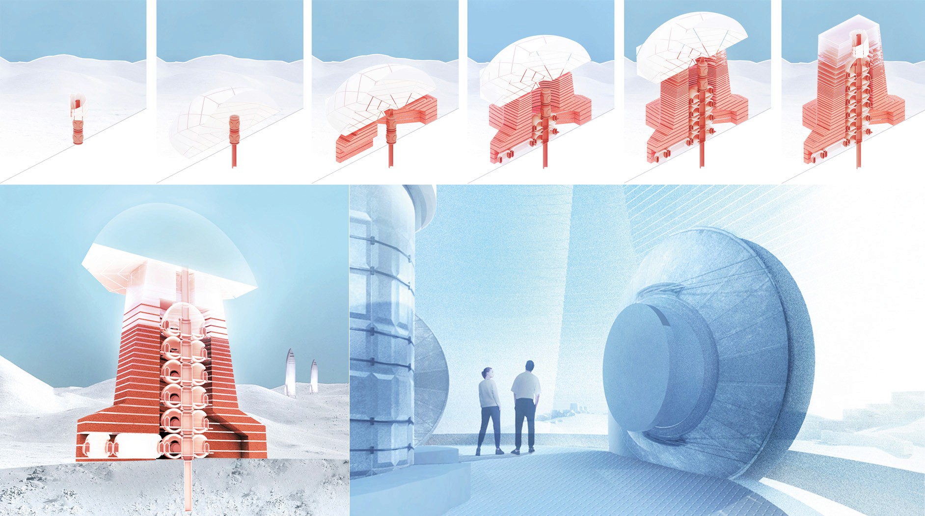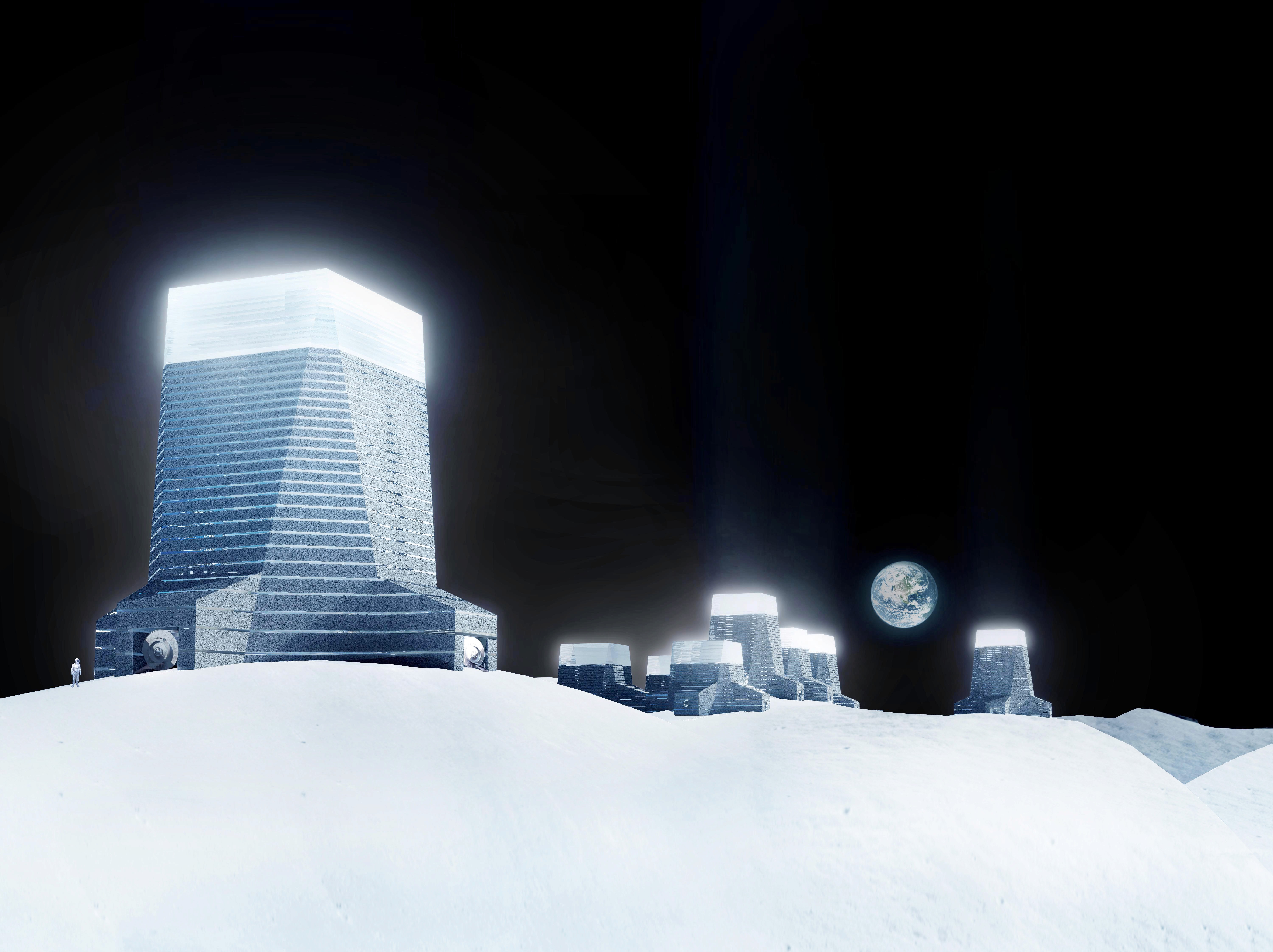 Lunar Lighthouse explores a hybrid radiation protection system combining lunar regolith with in-situ grown bacterial nano-cellulose membranes. Conceptually located on the rim of Shackleton Crater, the structure leverages the natural shielding properties of regolith while introducing a translucent nano-cellulose layer that reinforces the architecture and enables vertical construction. The regolith mass provides primary radiation protection, while the nano-cellulose membranes stabilize the structure and create a semi-transparent envelope. This hybrid material strategy allows sunlight to penetrate the habitat, bringing natural illumination into the interior spaces while maintaining effective shielding from harmful cosmic radiation. Beyond its structural and environmental functions, the design also addresses astronaut well-being. Long-duration missions on the Moon can produce significant psychological strain, particularly due to isolation and the distance from loved ones on Earth. The project proposes a transparent observation module at the top of the structure, allowing astronauts to see the home planet in the lunar sky. This visual connection with Earth could help reduce feelings of isolation and provide emotional reassurance during extended missions. The translucent nano-cellulose layer would also softly glow when illuminated from within, making the structure visible across the lunar surface. During extravehicular activities, the base would act as a navigational beacon, much like a lighthouse guiding sailors at sea, helping astronauts orient themselves and safely return to the habitat.
