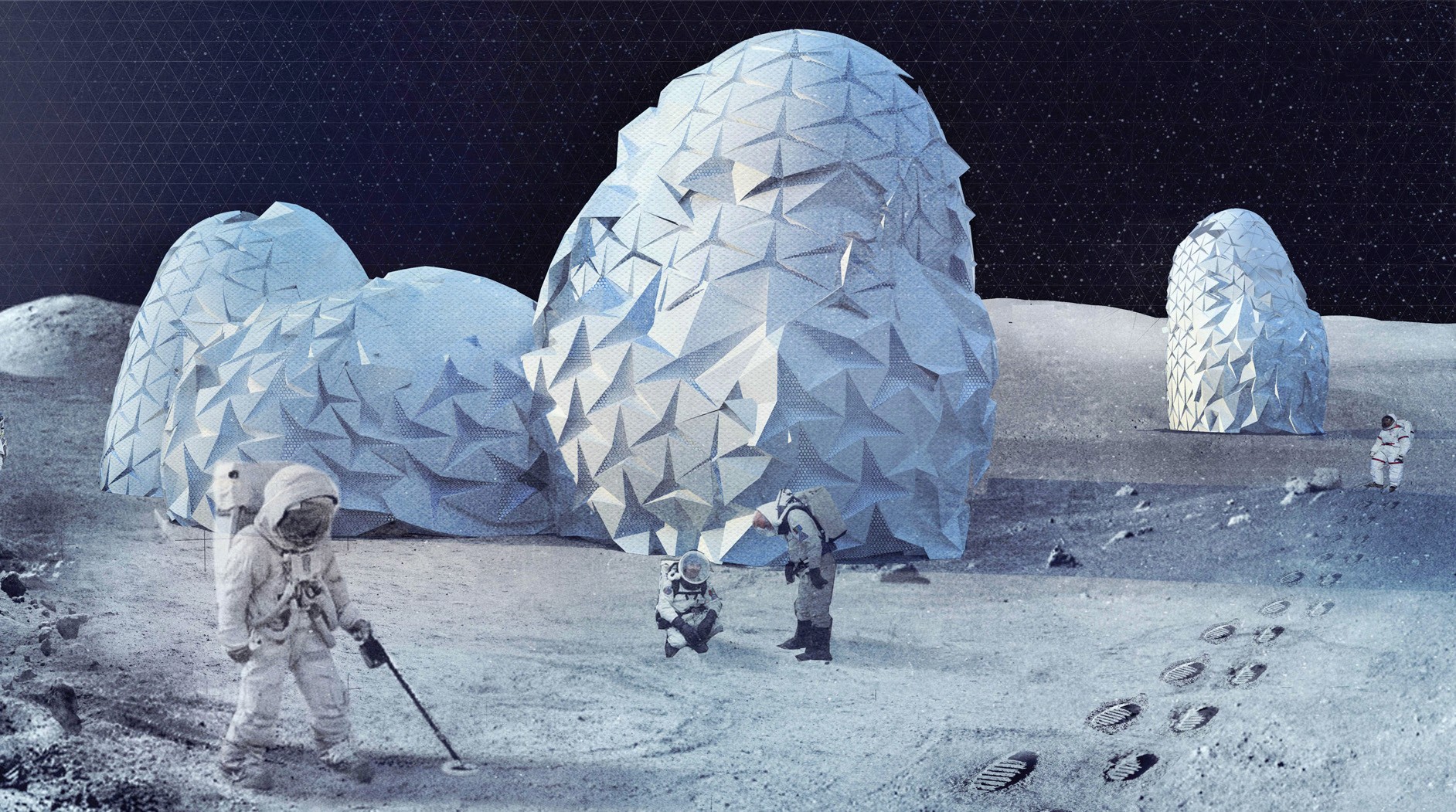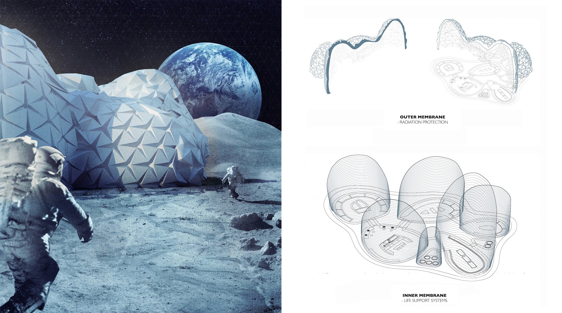 Lunar Testlab envisions a gradually expanding lunar settlement structured like a nested “Babushka Doll,” where layered protection defines habitable space. At its core are pods containing living quarters, laboratories, and greenhouses, surrounded by a protective void and a self-assembling 3D-printed outer membrane. Based on origami principles, the membrane shields against radiation and micrometeorites while supporting oxygen and water production.