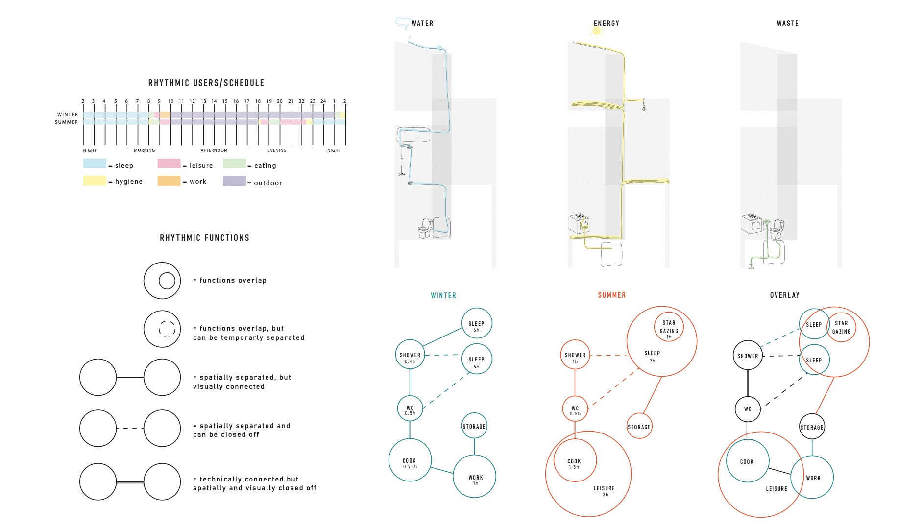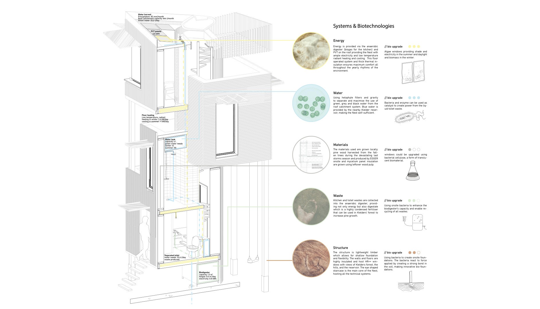 The Rhythmic Nest is a seasonally adaptive tiny house designed for an observatory site in Kielder Forest. Hosting researchers in winter and tourists in summer, the structure responds to shifting user needs and environmental cycles. The self-sustaining micro-home integrates novel biotechnologies and passive environmental strategies to harness seasonal variation. Its adaptable spatial configuration reflects changing rhythms of occupation, demonstrating how small-scale architecture can dynamically align with both ecological context and human routines.